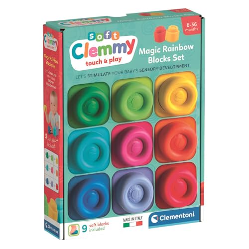 Clementoni Soft Clemmy Magic Rainbow Blocks Set, 9 mjuka byggklossar för barn 6+ månader, tillverkat i Italien, tvättbart och giftfritt, sensorisk utveckling och manualitet, 17604