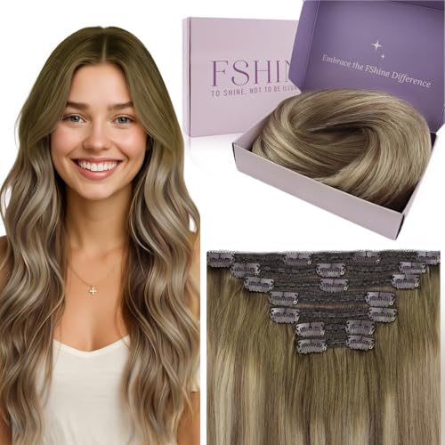 Fshine Clip in Extensions äkta hår 35 cm 120 g förlängningsklämma i äkta hår osynligt mörkbrun till askbrun med ljusblond Remy hårförlängning, äkta hår 7 stycken i färgen 3,8 22
