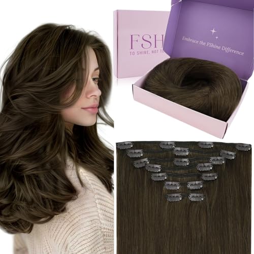 Fshine Clip in Extensions äkta hår brun, 40 cm 120 g äkta hår förlängningsklämma mörkbrun 7 stycken hårförlängningar äkta hår klämma i hårförlängning färg 2