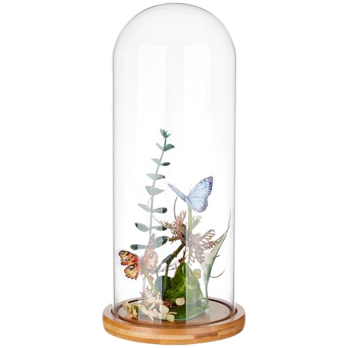 BENECREAT 11,7 x 30 cm evig transparent blomglasskydd, glasdisplay kupol Cloche-burk med sandbrun massiv träbas för gör-det-själv blomhantverk