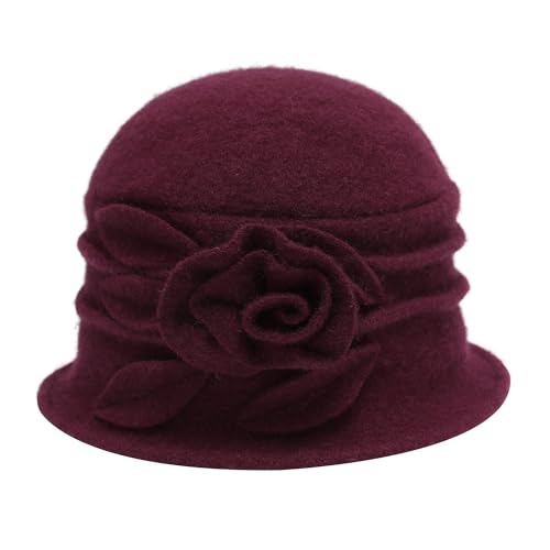 ZLYC Dam ull cloche hinkhatt 1922-talet vintage klänning vintermössor med blomma accent, Blommig hallon, one size