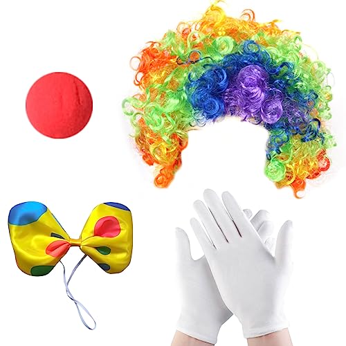 VOSSOT Clown Kostym tillbehör Clown kostym tillbehör, lockig Clown-peruk + Clown-näsa + färgglad slips + handskar, lämplig för påsk, konstevenemang, cosplay karnevalsdräkt
