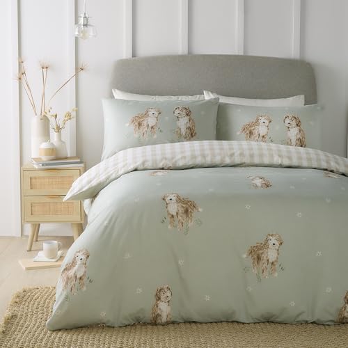 Fusion – Hattie The Cockapoo påslakan – king size-sängkläder (230 x 220 cm) – vändbara mönster (Gingham) – 2 örngott – gröna sängkläder med hundar – rutigt/rutigt påslakan i naturligt