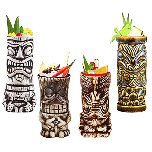 Tiki muggar cocktailset med 4 – stora tumlare keramiska Hawaiian Luau partymuggar dryckesartiklar, söta exotiska cocktailglas, Tiki Bar professionella Hawaiianska festbarartiklar, TKSET0005.