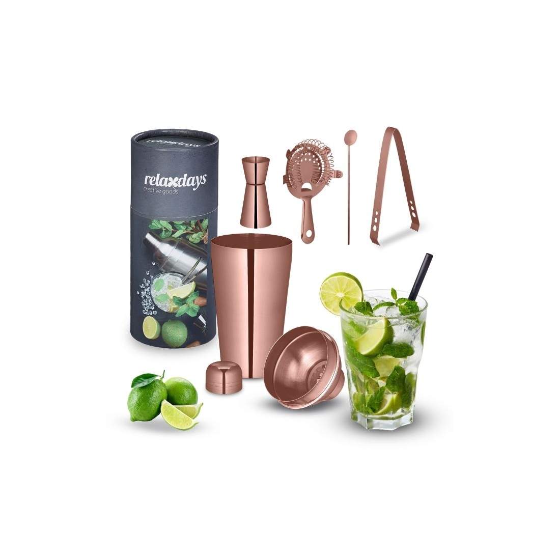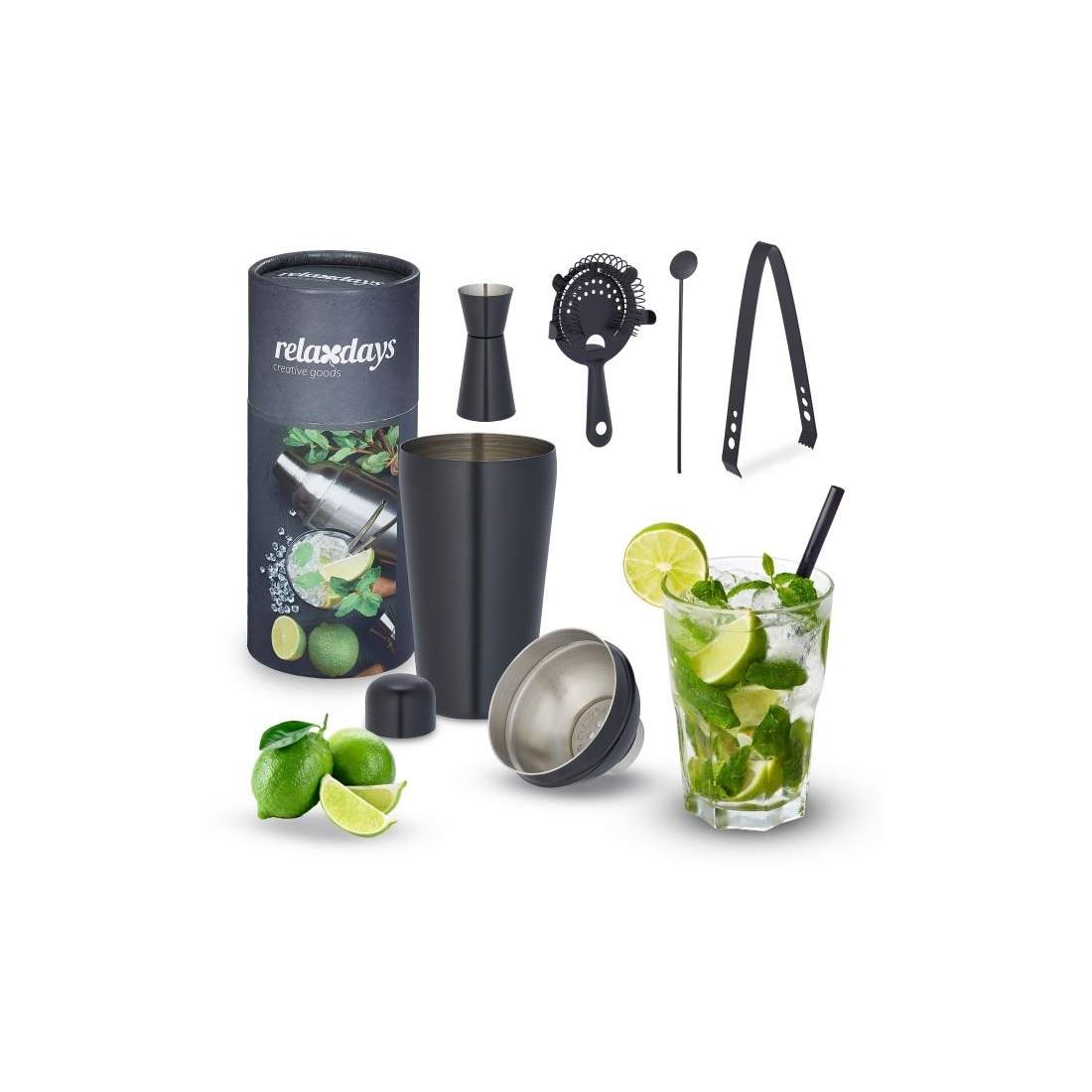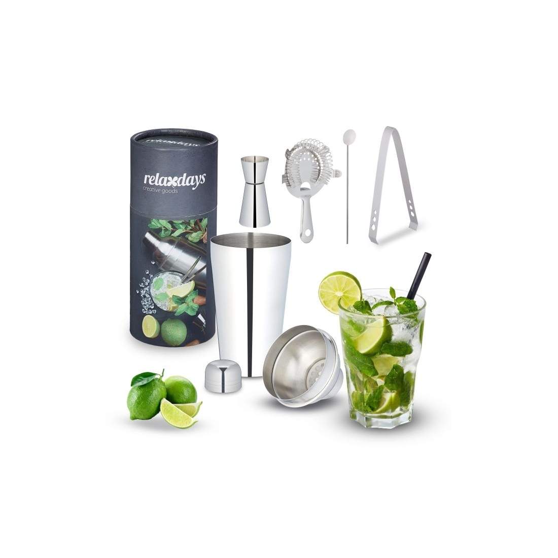 Relaxdays cocktailset 5 delar, rostfritt stål, shaker, sil, barsked, tång, cocktailshaker, barmått, silver