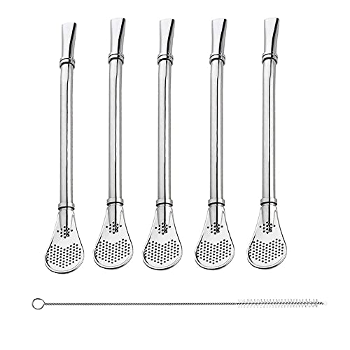 5 stycken återanvändbara sugrör, Yerba Mate sugrör i rostfritt stål, filtrerad sked, med 1 rengöringsborstar, för te, kaffe, citronte, juice (silver)
