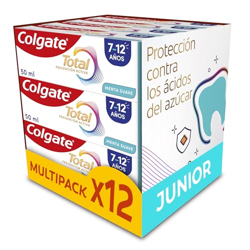 Colgate Total junior tandkräm, 12 st x 50 ml, komplett skydd, fluorinnehållande tandkräm, anti-karieskydd, antibakteriella ingredienser, återvinningsbar produkt
