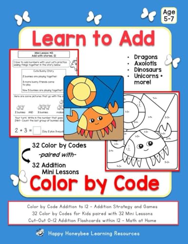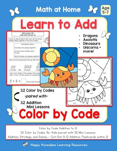 Math At Home - Learn to Add Color by Code Addition to 12 with Axolotls, Dinosaurs, Dragons, Unicorns + More: Age 5 to 7 - 32 Color by Code for Kids ... - Cut-Out 0-12 Addition Flashcards within 12