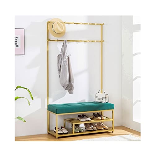 LHHL Klädhängare Skoställ 3-i-1 Hall Träd Fristående Klädställ Med Hyllor Krokar Skoställ För Kläder Sko Väskor Plånböcker Ram Av Smidesjärn Enkel Montering (Color : Gold green, Size : 80x35x175cm)