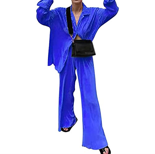 Sawmew Kläder I Två Delar för Kvinnor Fritidskläder Plisserade Loungewear-set Plisserade Skjorta Byxor Set Långärmad Button Down-skjorta Långbyxor Med Hög Midja (Color : Dark blue, Size : L)