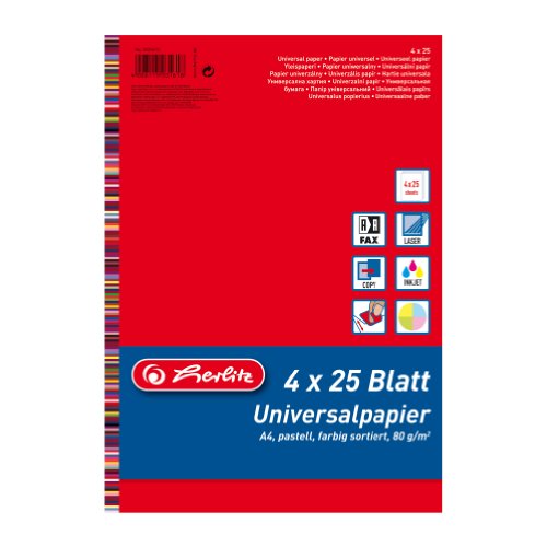 Herlitz 5031612 universalpapper Colourmix pastell, A4, 80 g/kvm, 100 ark sorterade färger: röd, blå, grön, gul