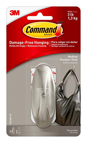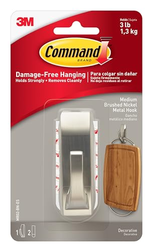 Command Medium borstad nickel designerkrok, inomhusbruk – 1 metall medium krok och 2 självhäftande remsor – hängjackor, plånböcker, handväskor, ryggsäckar, hattar, halsdukar, hundkoppel – organisera