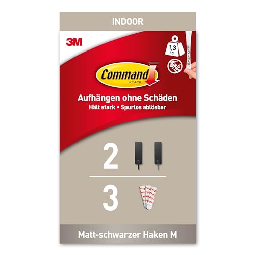 Command Dekorativ krok, matt svart krok, inomhusbruk – 2 medelstora metallkrokar och 3 självhäftande remsor – häng jackor, plånböcker, handväskor, ryggsäckar, hattar, halsdukar, hundkoppel – organisera skadefri