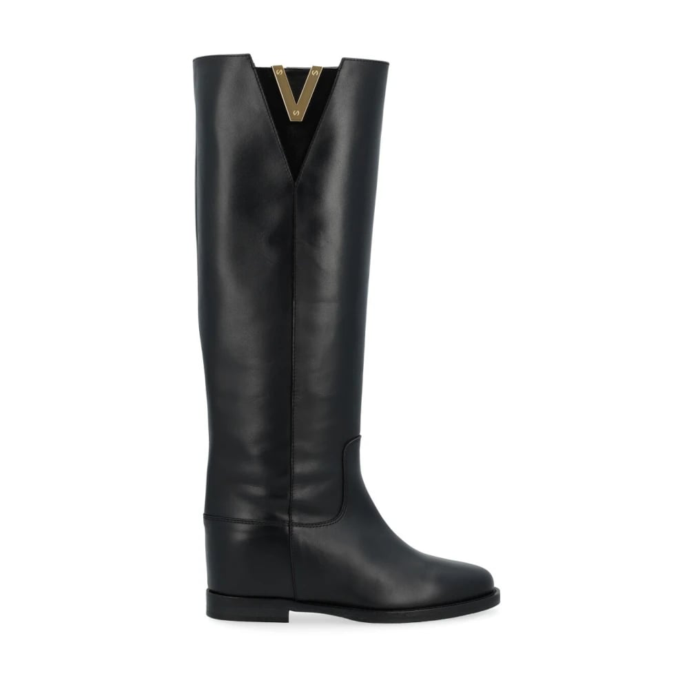 Via Roma 15, Skor , Dam, 36 EU, Läder, Svart Höga Stövlar med guldmetall V-detalj