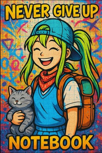 Never Give Up Graffiti Girl Notebook – Cool Green-Haired Girl with Kitten | 6x9 Lined Journal: Urban Art Style | DREAM BIG Motivation | 100 Lined Pages | Cute Cat Lover Sketchbook