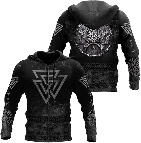 Norse Vintage Valknut 3D Tattoo Hoodie,Herr Viking Warrior Vegvisir Zip Sweatshirt Pullover, Personlighet Cool Streetwear Casual Jacka Toppar Lätt Träningsoverall