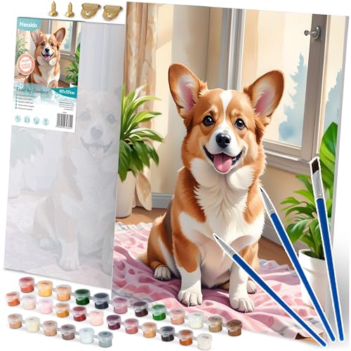 Massido måla efter siffror 40 x 50 cm, set med 3 penslar 30 färger krokar Corgi hund
