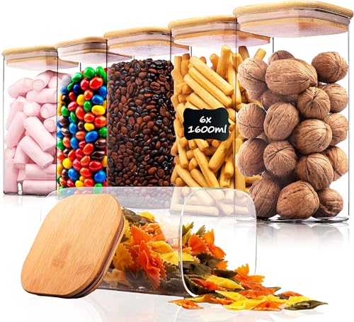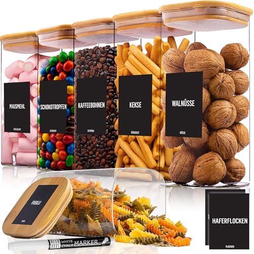 Deco Haus® Förvaringsglas med Lock, 6-set + Etiketter [LUFTTÄT] - För Müsli, Cornflakes, Spaghetti - Förvaringsburkar i Glas med Lock - Förvaringslåda Kök - Förvaringsglas 6x1600ml