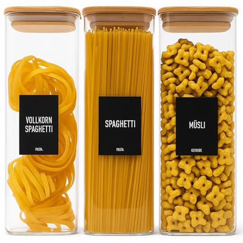 Deco Haus® Förvaringsglas med Lock För Spaghetti, 3-set 1950ml + Etiketter [LUFTTÄT] - För Müsli, Cornflakes, Mjöl - Förvaringsburkar i Glas med Lock - Förvaringslåda Kök – Förvaringsglas