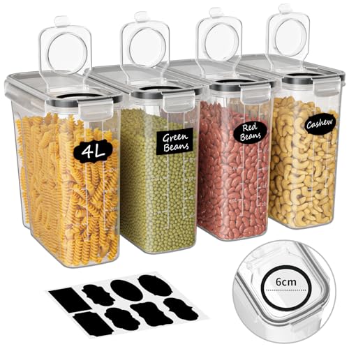5,2 l stora förvaringsburkar med lock, lufttäta, set om 4 med kritmarkörer och etiketter, BPA-fri plast, förvaringslåda, kök, sockerpasta mjöl müsli, cornflakes förvaring, förvaringsbehållare