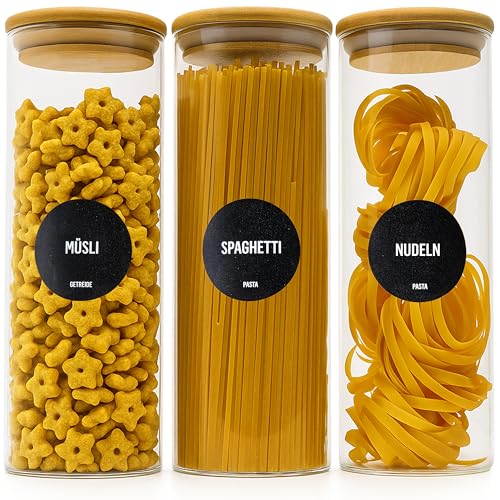 Deco Haus® Förvaringsglas med Lock För Spaghetti, 3-set 2300ml + Etiketter [LUFTTÄT] - För Müsli, Cornflakes, Mjöl - Förvaringsburkar i Glas med Lock - Förvaringslåda Kök - Förvaringsglas