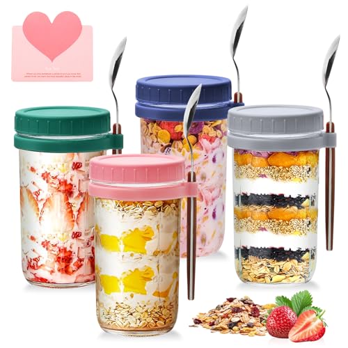 UCAMP 600 ml återanvändbara glasburkar, lock och skedar, kyld yoghurthållare för yoghurt, gröt, cornflakes och müsli sallader
