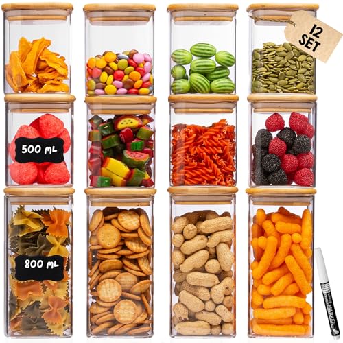 Deco Haus® Förvaringsglas med Tätslutande Lock + Etiketter [12-pack KOMBISATS] - För Müsli, Cornflakes, Spaghetti & co. - Förvaringsburkar i Glas med Lock - Förvaringsglas - Förvaringslåda Kök