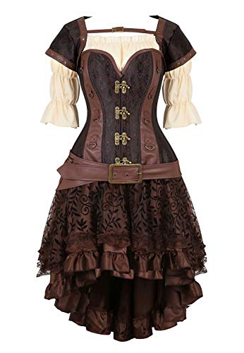 Steampunk Corset klänning Bustier Top kjol Shirt 3 pcs läder Gotiska pirat Victorian Burlesque Halloween kostym Brun 5XL