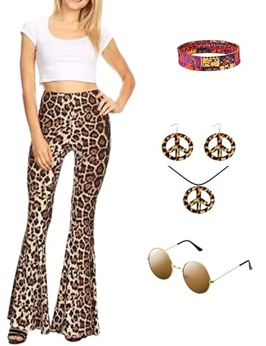 CosCool Dam 70-talet, 80-talet, hippie-kostym, utsvängda byxor, hippie, disco byxor, set med hippie-tillbehör, leopard L