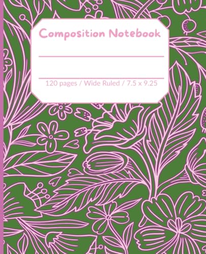 Composition notebook: Pink Floral Notebook- Cotton Candy Flowers on Moss Green Cover| Wide Ruled Notebook| Composition notebook wide ruled, 7.5 x 9.25, 120 Pages, For kids, teens and adults
