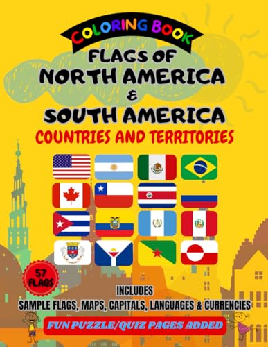 Flags of North America and South America Coloring book - Countries and Territories: 57 Flags Coloring book, includes sample flags for coloring guide, ... and currencies of each Country or Territory.
