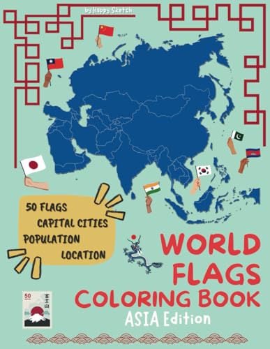 WORLD FLAGS COLORING BOOK ASIA Edition: "Discover and color: 50 Asian flags! Each page includes the location on the map, the capital, and the population of each country."