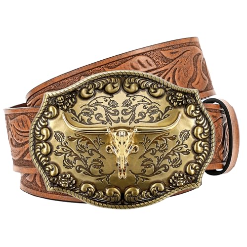 JasGood Western läder cowboy bälte för män kvinnor långhorn spänne cowgirl bälte blommig graverad präglad vintage unisex bälte för jeans, BRUN, 110cm: Fit Taille Größe 87cm-96cm