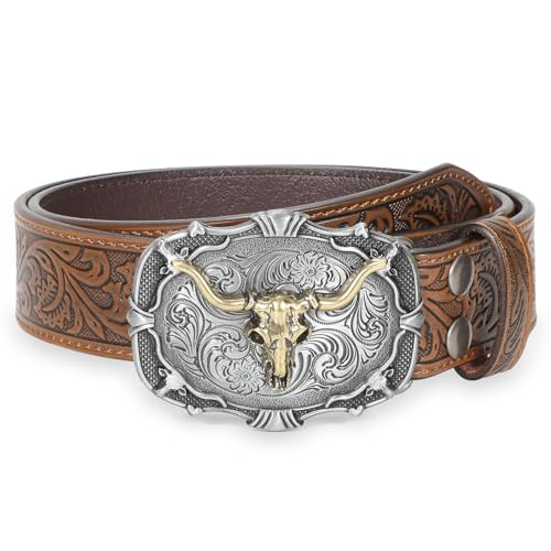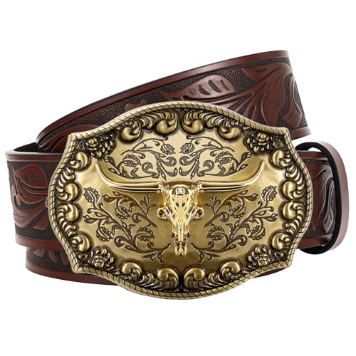 JasGood Western läder cowboy bälte för män kvinnor långhorn spänne cowgirl bälte blommig graverad präglad vintage unisex bälte för jeans, Mörkbrun, 110cm: Fit Taille Größe 87cm-96cm