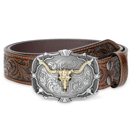 WHIPPY Cowboy bälte västerländska bälten för män kvinnor med graverat blommigt tjurhuvud spänne västerländsk läderspänne bälte för jeans, Kaffe-koppar, Fit waist size 32"-36"