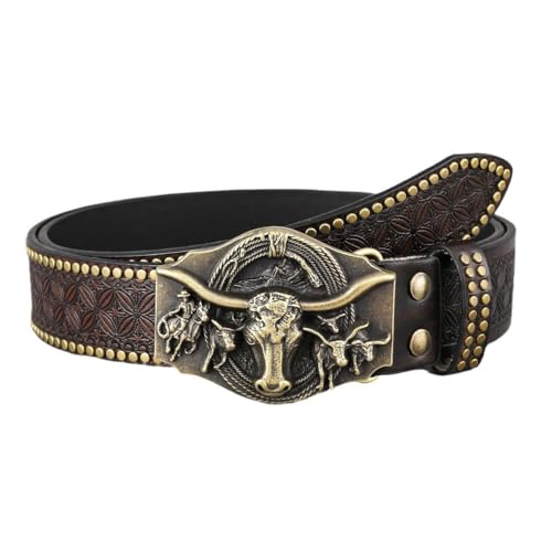 Wisebom Western cowgirl läderbälte, herr cowboy bälte västerländska bälten för män kvinnor med graverad blommig tjurhuvud spänne västerländsk läderspänne bälte för jeans, Brun, 110 cm: Fit Waist 35-38