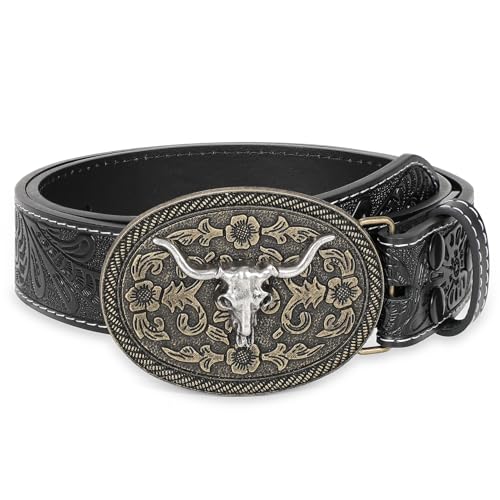 JasGood Western läder cowboy bälte för män kvinnor långhorn spänne cowgirl bälte blommig graverad präglad vintage unisex bälte för jeans, svart, 120cm: Fit Taille Größe 97cm-106cm