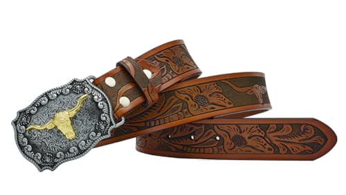 Western Leather Spänne Bälten Cowboy Longhorn Bull Spänne Bälte Blommig präglade Cowboy Bälten för män (47,3 tum långa)