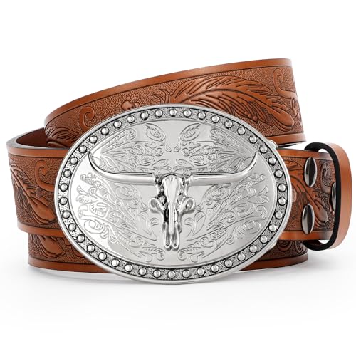 JasGood Western läderbälte för män kvinnor cowboy cowgirl herrbälte graverat präglat läderbälte med avtagbart spänne för jeans byxor rodeo, En-brun, M:Passend für Taillenumfang 86cm-95cm