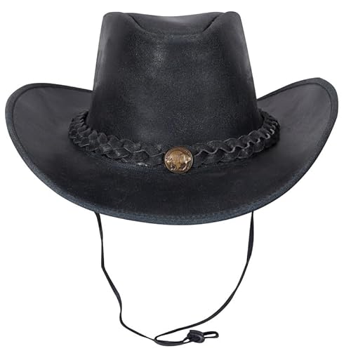 URBAN 5884 Äkta läder cowboyhatt, herr/dam äkta kohud västerländsk hatt, formbar brätte och justerbar hakrem, Svart, S