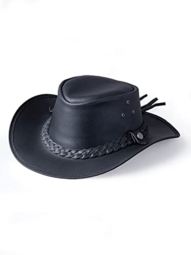 URBAN 5884 Äkta läder cowboyhatt, herr/dam äkta kohud västerländsk hatt, formbar brätte och justerbar hakrem, Svart, L