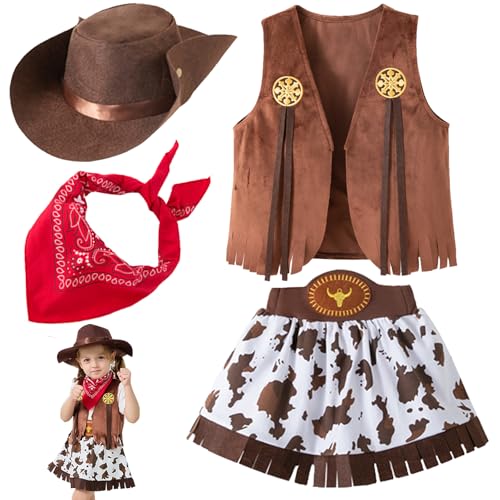 LUKIUP 4 stycken cowgirl kostym, kläder, utklädnad, cowboyhatt barn med bandana, väst och hatt, kjol, västerländsk, kostym för barn, halloween, karneval, cosplay, fest