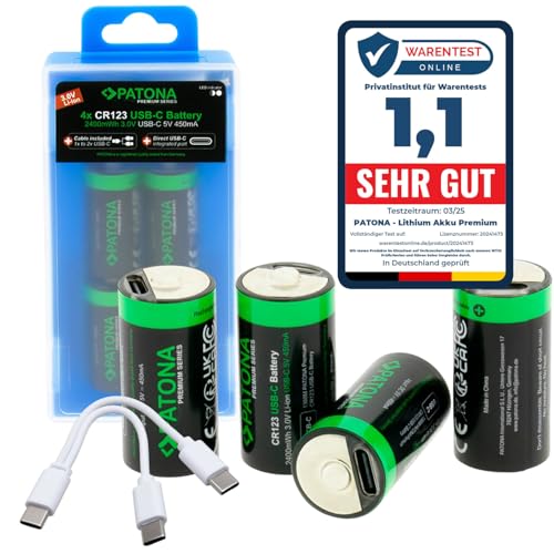 PATONA 4X USB-C Premium CR123A-batterier, 2 400 mWh 3,0 V batteri, uppladdningsbar, 1 till 2 USB-C-laddningskabel – hållbar över 1 000 laddningscykler för kameror fjärrkontroller ficklampor