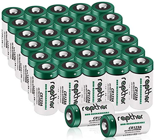 Rapthor 32-pack 1650 mAh CR123A 3 V litiumbatteri CR123/123A/CR17345 för Arlo-kamera ficklampa hög kapacitet med PTC-skyddad [Ej laddningsbar]
