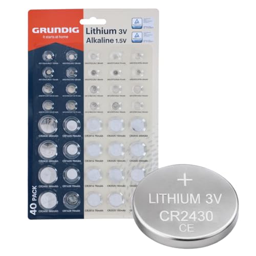 Grundig Knappcellsbatteriset 40 stycken – litium 3 V och alkaliskt 1,5 V – CR2032 AG13 CR2025 inkl. – TÜV-certifierad i blisterförpackning