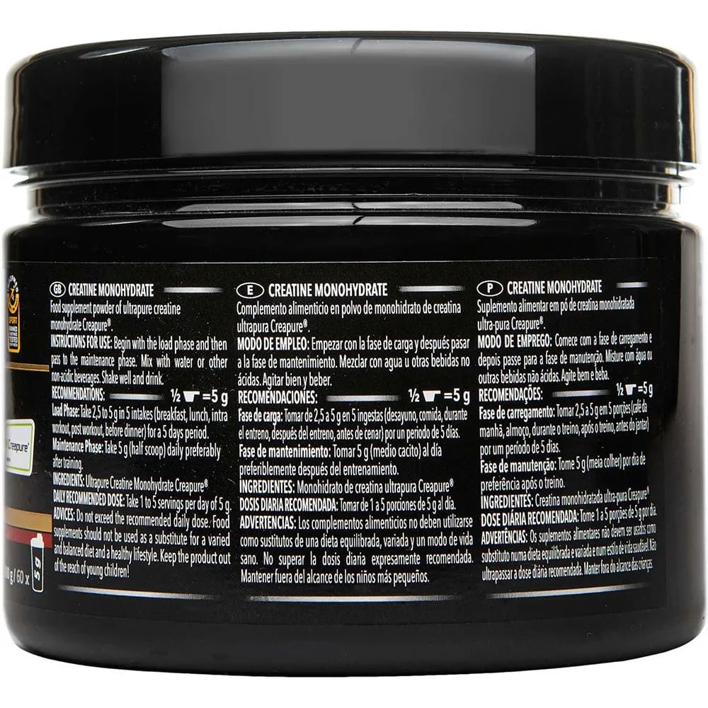 Kreatin Monohydrat. Proteiner för muskelmassa. Kreatin i pulverform. Idealisk för gym före träning. Creatine Creapure monohydrat perfekt som sporttillskott. Creatine monohydrate. Behållare på 300 grm.