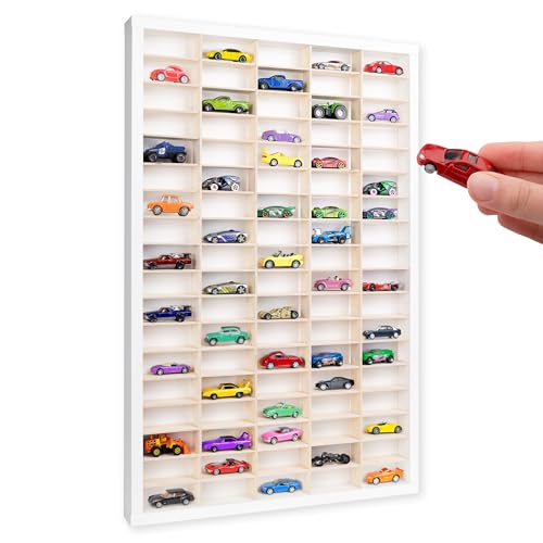 Creative Deco Vit samlarmonterare i trä för bilar - 90 justerbara fack | Vertikal vägghylla för miniatyrer | Vitrinskåp Hängande samlarmonterare 80 x 51 x 5,5 cm