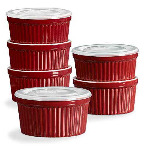ONEMORE Keramiska ramekiner med lock – 237 ml, set med 6 – ugnssäkra bakformar/koppar – för crème brulee, pudding, serveringsdipp, frukt, glass – röd