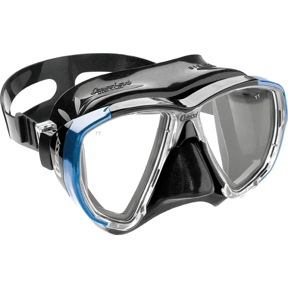 CRESSI Big Eyes Mask svart/svart 380 UV blå/orange linser - enkel stor ögonmask för dykning och snorkling