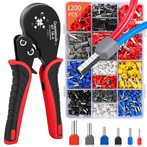 Grasomtools ® Ferrule crimpverktygssats, dubbla och enkla hylsor, GT16-4 fyrsidig spärrhake käke tråd presstång (0,08-16 mm²) med 1 200 st terminalanslutningshylsor